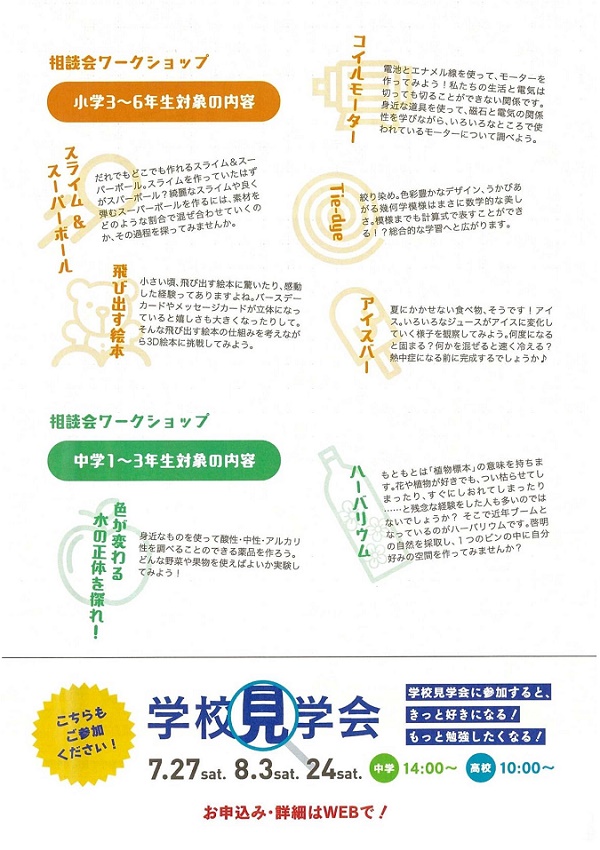 この7月21日(日)の「自由研究相談会」のワークショップでは、小学生(3~6年生)対象には、「スライムボール」、「飛び出す絵本」、「コイルモーター」、「Tie-dye」、「アイスバー」の5つの講座(内容)、中学生(1~3年生)対象には、「色が変わる水の正体を探れ!」、「ハーバリウム」の2つの講座(内容)が行われます。