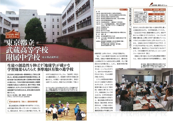 「2008年に併設型中高一貫教育校として新たに開校した、東京都立武蔵高等学校附属中学校は、高校の前身である東京府立第十三高等女学校の設置から数えると、78年の歴史を誇る伝統校。武蔵野の緑豊かな風土にも恵まれる、素朴で明るい校風が自慢だが、カリキュラムにも入念な工夫を凝らし、地球規模でものを考えられる、好奇心豊かな生徒を育てている。」