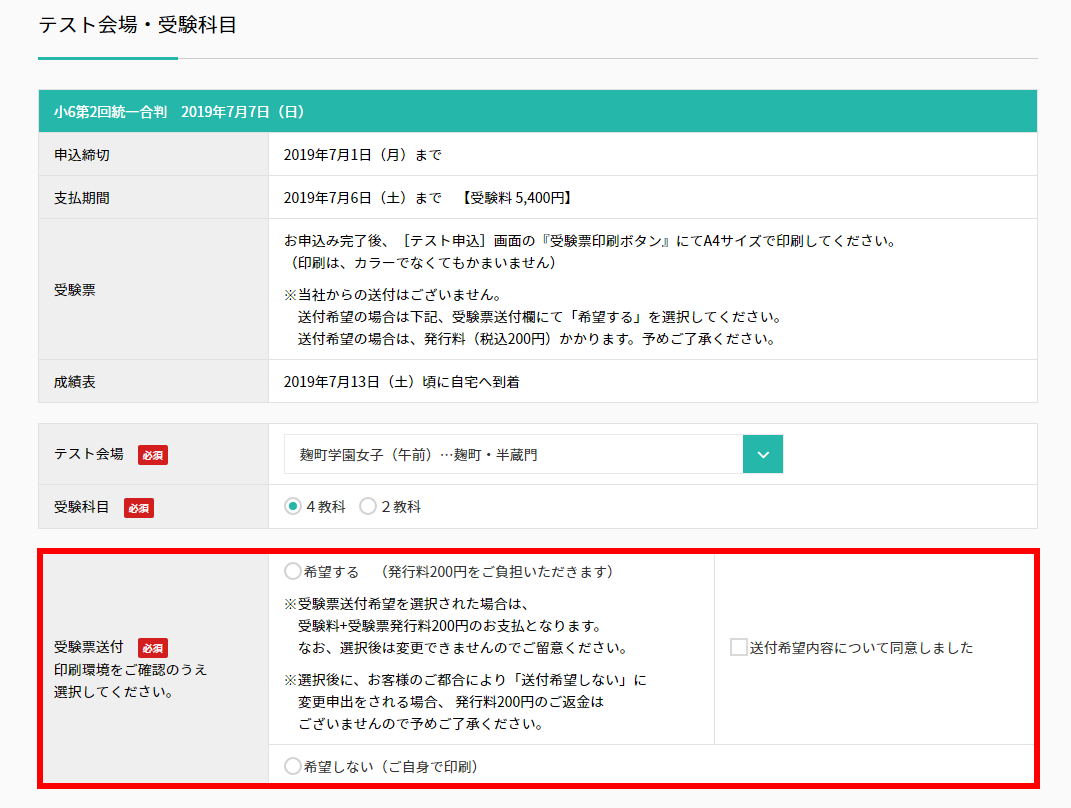 ※2019年7月より[受験票送付]の確認項目(図赤枠部分)が追加されました。(発送希望の場合は手数料+200円がかかります)