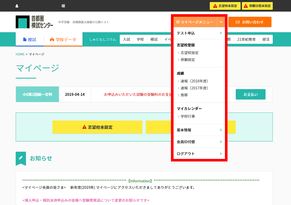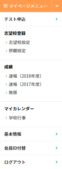 マイページにログインすると黒い[マイページログイン]ボタンがオレンジ色[マイページメニュー]ボタンに表示が切り替わります。[マイページメニュー]にカーソルを合わせるとさまざまなメニュー項目が表示されます。 ※2018年度から画面の仕様が変わりました。