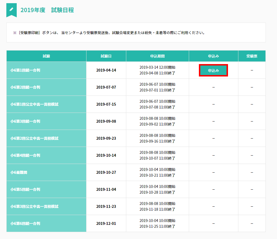 [2019年度 試験日程]から該当する試験の[申込み]をクリック。
