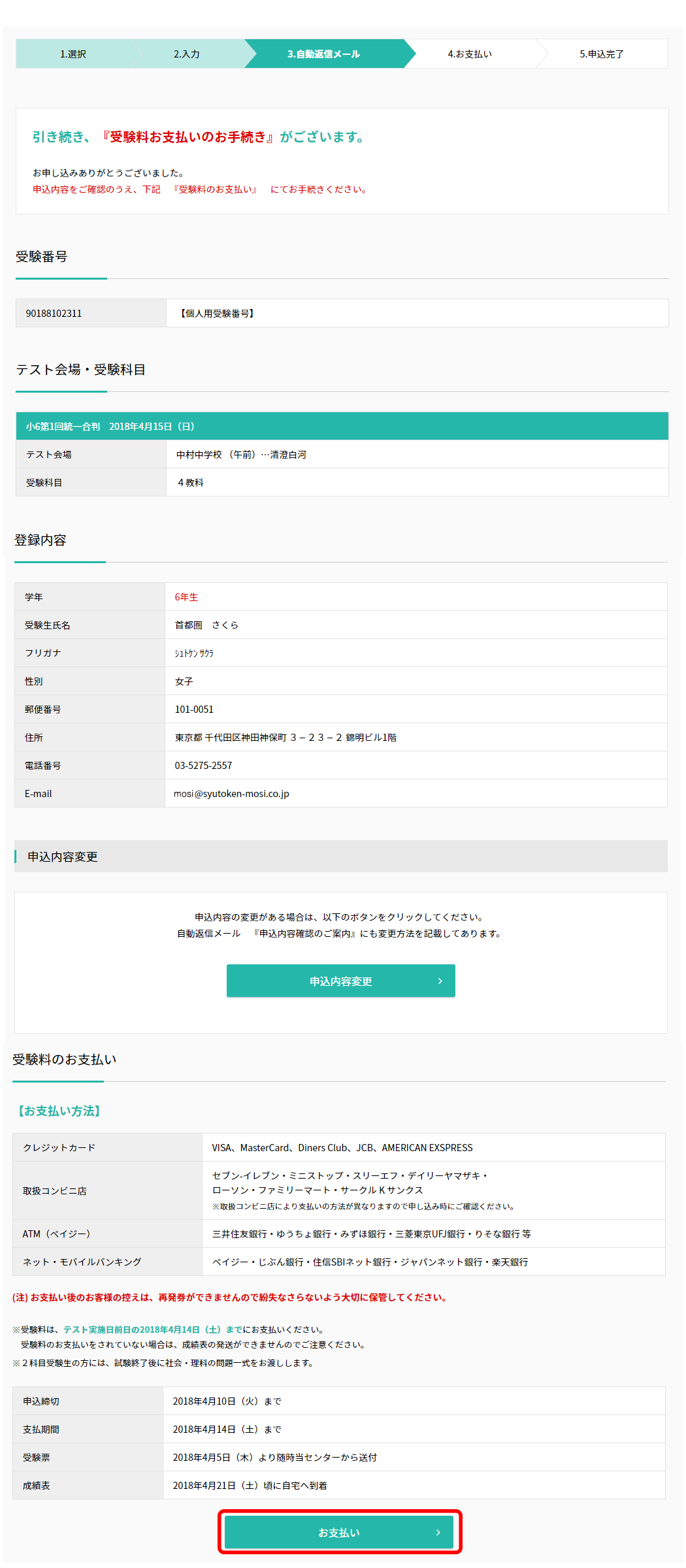 申込み内容をご確認の上[お支払い]をクリック。(変更したい場合は[申込内容変更]から修正してください)
