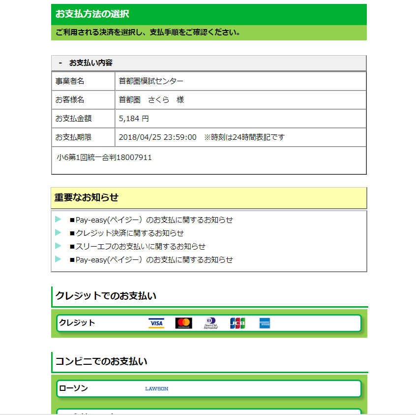 ご希望のお支払い方法を選択の上、実施日前日までにお支払いください。