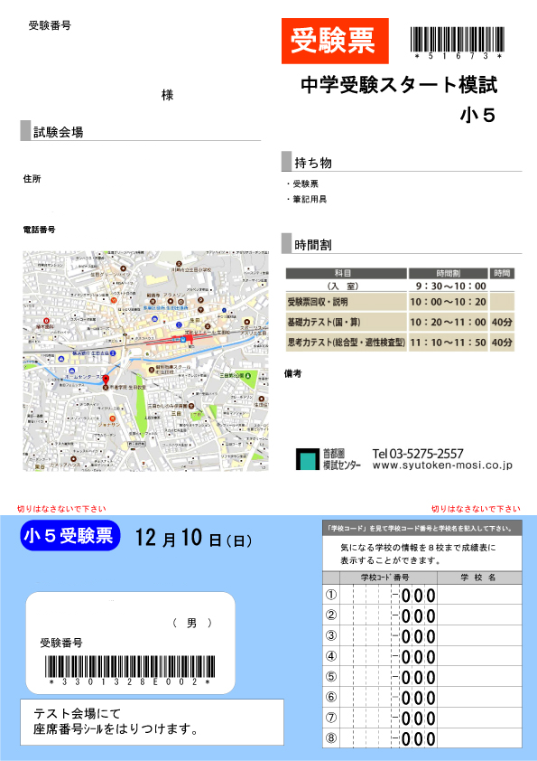 受験票に時間割は記載しておりませんので、必ず受験されるお教室に詳細をご確認ください。