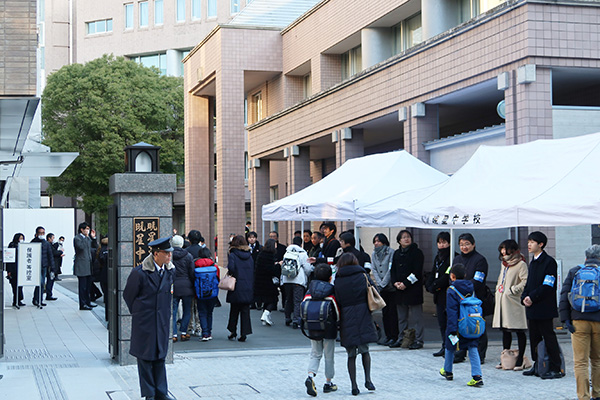 予定では7:50~の入場開始予定でしたが、すでに多くの受験生が集まっていることもあり、この日は予定を繰り上げて7:40から試験会場となる校舎への入場を開始。待機した受験生たちが一斉に会場へと向かいます。