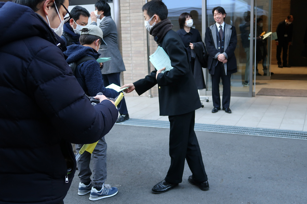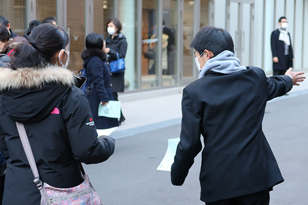また、この日は在校生たちが、校内の誘導員として会場運営に参加。受験生と保護者に手渡しで本日の「予定表」を配布します。憧れの「7つボタン」の詰襟を纏った在校生の姿を目の前に、少しはにかんだ様子で予定表を受け取る受験生たち。礼儀正しく誘導する在校生たちの姿に、将来のわが子を重ねるように見つめる保護者の姿が印象的でした。