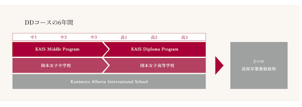 DDコースに入学すると、国本女子とKAISの2つの学校の授業を受けることになります。中1から3年までは、KAIS Middle Program。アルバータ州の中学校で行われている授業(English Language Arts)に加え、英語4技能を鍛えRU3年間。高校1年からはKAIS Diploma Programで学びます。