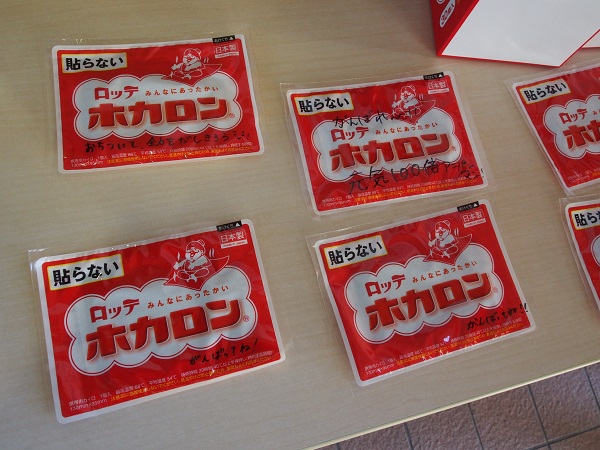 在校生から渡されるのは、案内の用紙と、直筆メッセージ入りのホッカイロ。緊張している受験生に、心も身体も温かくなってもらおうという配慮が感じられます。