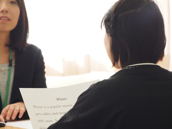 入室すると、受験票を渡し、座るように促されます。名前、どこから来た、年齢、趣味は何、など簡単なやり取りから、4~5行書かれた英文を渡され、黙読の後、音読、その後その文章に関する質問が1つ聞かれます。ここまでは英検とほぼ同じです。ただ、英検よりもずっと柔らかい雰囲気で、リラックスできるような配慮を感じ取れました。