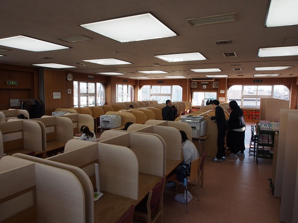 集合時間の15時30分、受験生はラーニングコモンズという、普段自習室として使っている広い部屋に通されます。ラーニングコモンズとは、もともと学生の学習支援を意図して大学図書館に設けられた場所のことを指します。情報通信環境が整い、自習・グループ学習の設備が用意され、相談係がいる開放的な学習空間のことを言います。もちろん、柳澤校長の発案です。