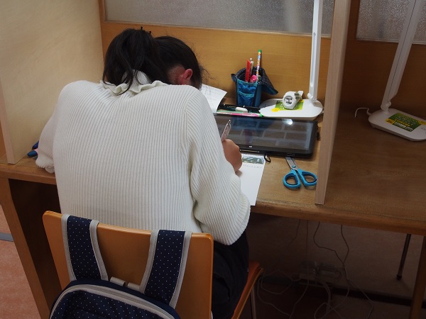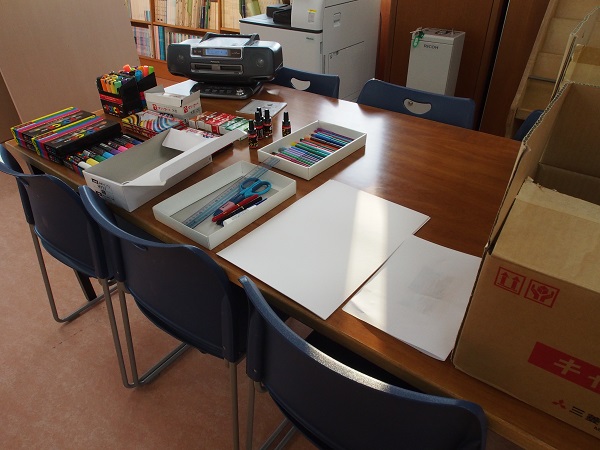 別場所に色鉛筆やカラーペン、などの文房具、またテーマに関する書籍が準備してあり、それをいつでも取りに行ったり、トイレに行ったりもできます。受験生同士が話をすることも可能だそうです。ネットで見つけた画像を印刷したい場合は、先生に頼んでやってもらいます。満足する書籍がなければ、先生と一緒に下の図書室に行き、2冊まで本を借りることもできます。はさみは左利き用のものまで用意している徹底ぶりです。