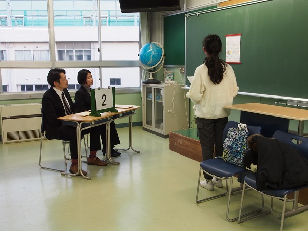 このテーマを選んだ理由、工夫した点、一番できた点はどこか、などの一般的な質問から、内容に関しての質問もしていきます。例えば世界遺産であれば「複合遺産」とは何か、他に日本の世界遺産知ってるか、など質問が多めにありました。ただ質問の仕方も柔らかく、落ち着いて意見や考えを述べることのできる雰囲気づくりを意識してされている印象を持ちました。