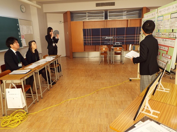 写真は、自身の出身地である埼玉県深谷市についてもプレゼンの最後に紹介し、そのために自作の「深谷ネギ」で大真面目に深谷市について語る姿に、プレゼンを受ける担当の先生も(おそらく笑いをこらえて)真摯な表情で話を受け止めていました。