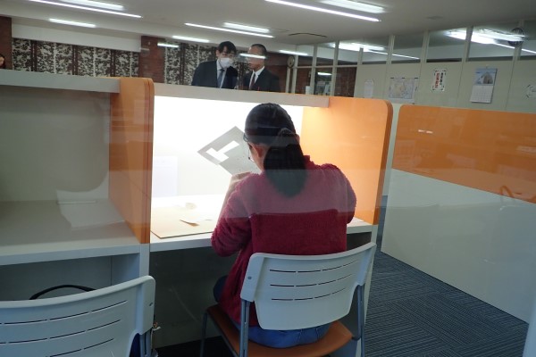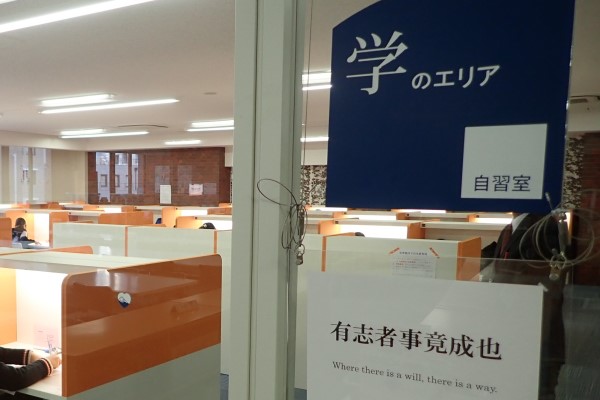 武家屋敷門を潜り校舎に入れば、誘導役の在校生が迎えてくれます。カフェテリアなどで一息ついて、14:30から入場開始。3号館5階の自学館(図書室)にある「学のエリア」(自習室)が今年の試験会場で、受験生はブースごとに指定された席に着きました。
