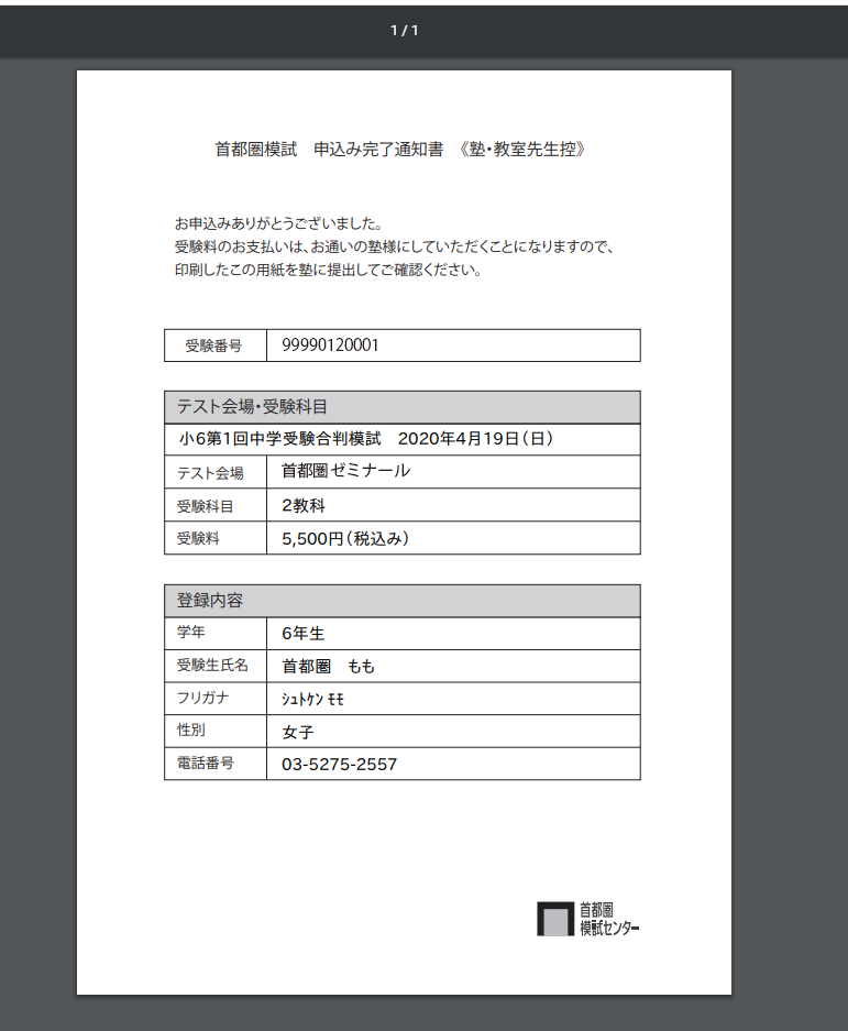模試の申込み完了後に『申込み完了通知書』を印刷して塾に提出していただく流れになっております。