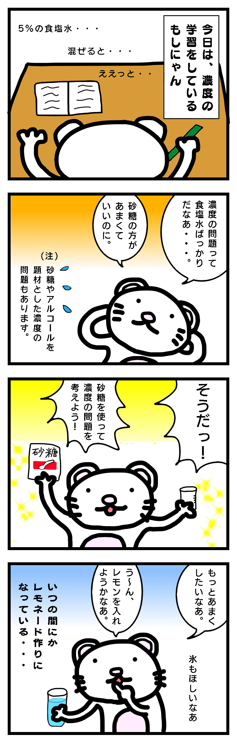 濃度の問題に取り組んでいるはずが、レモネード作りになってしまいました。わかりづらい場合は、実際に物を使って考えてみることも大切です・・・。