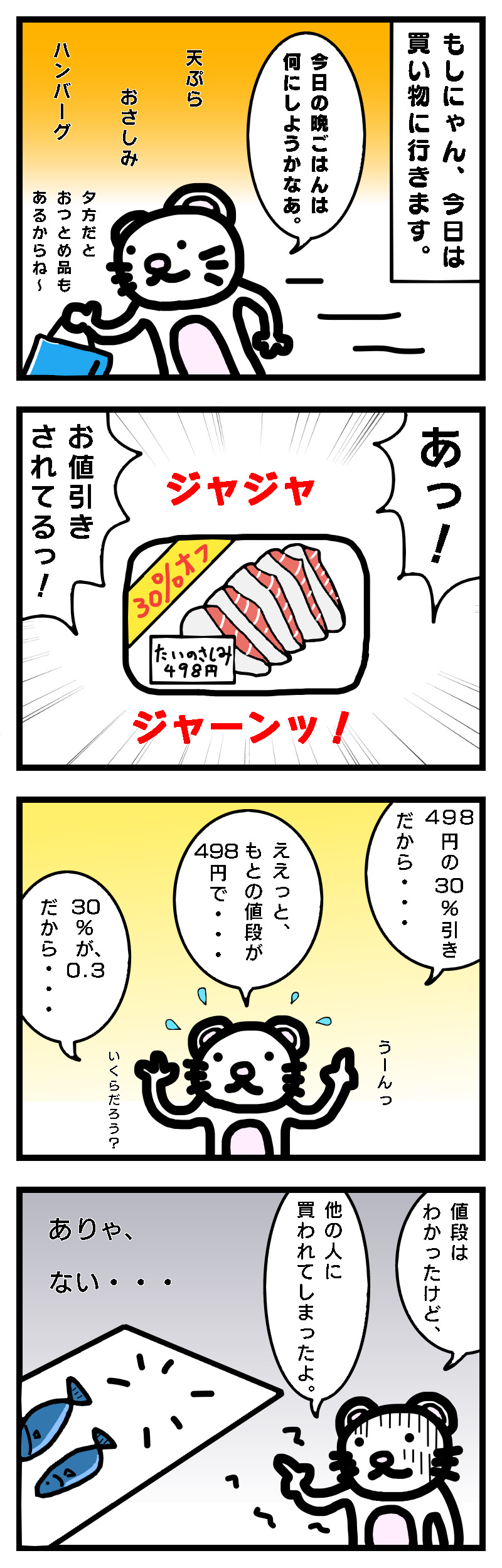 買い物に出かけた、もしにゃん。「おつとめ品」を見つけたようです。