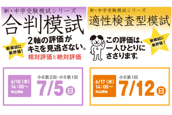 7/5(日)合判模試、7/12(日)適性検査型模試は「学校会場」での実施を中止し、「塾内受験・自宅受験」のみとさせて頂きました。 ※塾申込みで「自宅受験」は可能です。