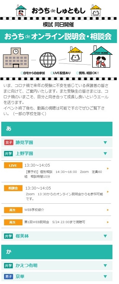 今回7/5(日)の小6第2回・小5第1回「合判模試」の同日開催となる「おうちde説明会・相談会」は、保護者やご参加各校からのご要望やご意見を生かして、ご参加方法が分かりやすいようにイベントのWebメニューも刷新しました。
