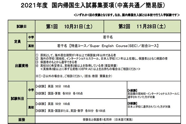 また国内の帰国生入試の概要も発表されており、10月31日(土)に第1回・11月29日(土)に第2回が行われます。試験科目は昨年と同様、『英語』か『国語・算数』の選択制です。詳しくは下記のPDFをご確認下さい。