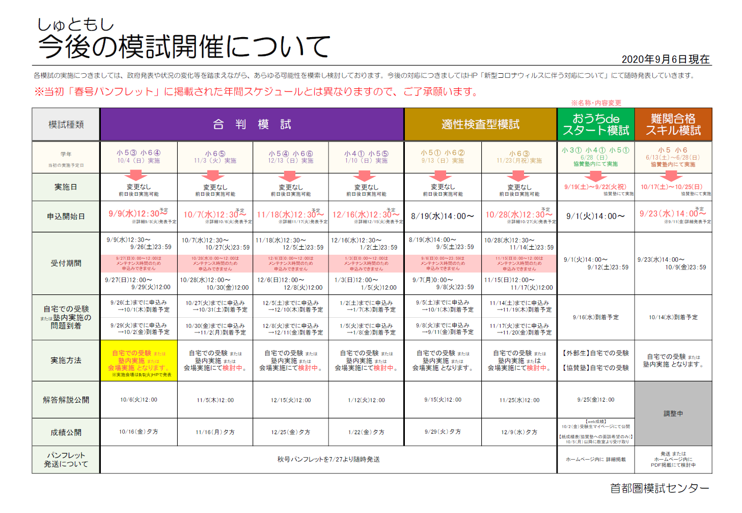 9月6日(日)合判模試につきまして、学校会場での実施の可能性を模索しておリましたが、昨今の新型コロナウィルス感染拡大の影響により、受験生の安全面を第一に考慮し、 弊社といたしまして合判模試の規模の開催は現時点で難しいと判断いたしました。