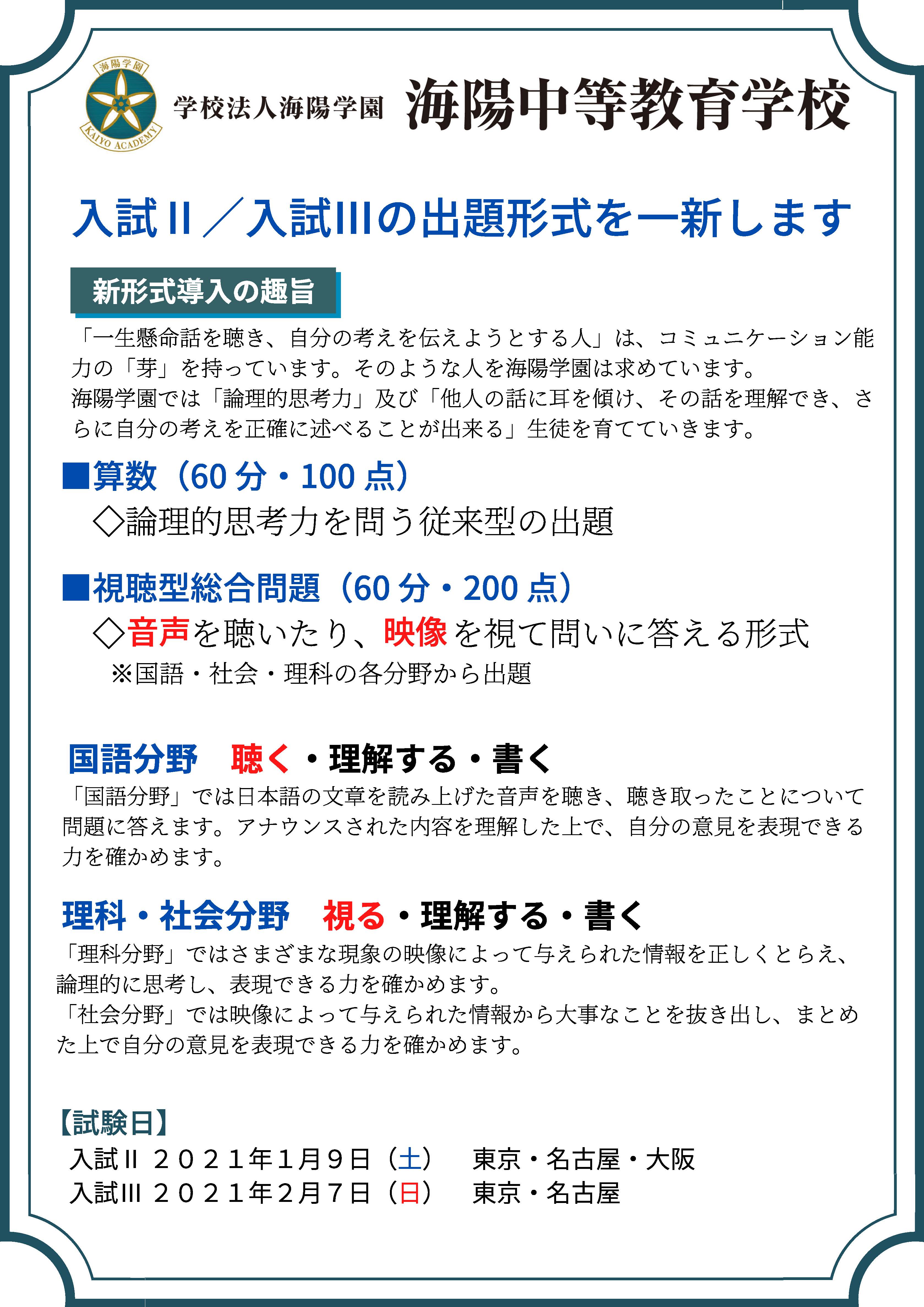 海陽学園が⼊試Ⅱ∕⼊試Ⅲの出題形式を⼀新!