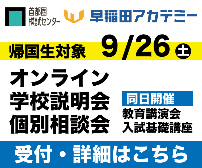 9月26日(土)には、10:00~16:00に時間帯に、帰国生対象の説明会・個別相談会(早稲田アカデミー主催・首都圏模試センター協力)が、今年はオンラインで開催されます。