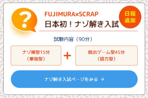 この新設「ナゾ解き入試」は、「ナゾ解き」「脱出ゲーム」で知られるSCRAPの制作協力を得て、藤村女子中が実施することが先に公表されています。