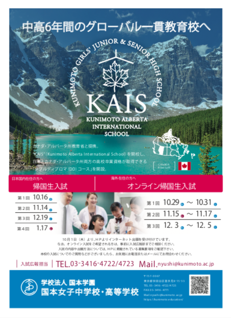 DDコース第1期生が学んでいるKAIS(カイス・KUNIMOTO ALBERTA INTERNATIONAL SCHOOL)の教室は、カナダ国旗やアルバータ州のエンブレムがガラス扉にあしらわれ明るく解放的。LAコース1期生も、通常授業に戻った学校に明るい声を響かせます。コロナ対策をとった上で行われている学校説明会やオンライン個別相談会では、コース1期生の手応えや入試などが伝えられています。<...
