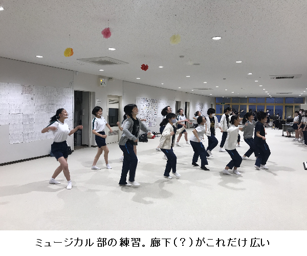 放課後、軽音楽部やミュージカル部が、普段は生徒たちが往来する校舎のちょっとしたスペースで練習をしていた。校舎内が広いので、ちょっとした体育館代わりに使用できる場所がいたるところにある。