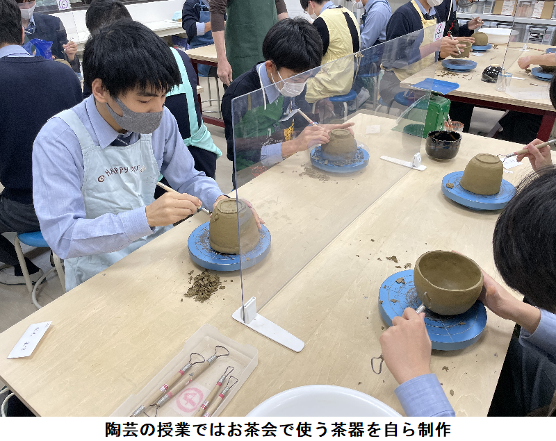 茶道を学ぶことで、和歌や陶芸、書道、華道への造詣も深まる。中1の家庭科ではふくさ袋を自分で縫い、それを5年間使う。高2ではお茶会で使うための掛け軸を自分で揮毫し、陶芸家の指導を受けながら茶器も自分たちでつくる。
