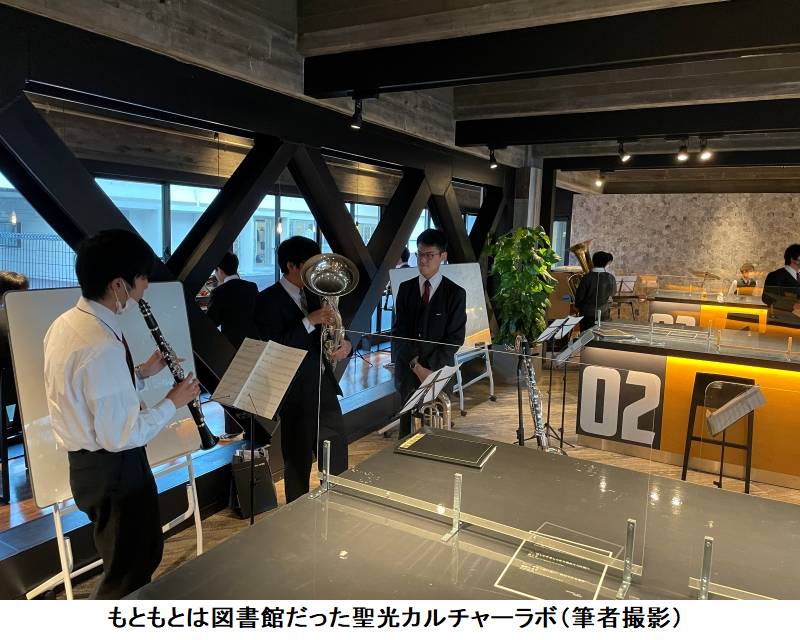 SCLを訪れると、吹奏楽部が学内演奏会を始めようとしているところだった。静岡聖光学院の吹奏楽部は順位を決めるような大会には出場しないポリシーだ。4月の定期演奏会と9月の文化祭が貴重な発表の場になっている。しかし2020年はどちらもコロナで中止となった。そこで、学内での演奏会を生徒たちが企画した。シックな空間に、管楽器がきらめき、窓越しには夕景が広がる構図は、まるでビルボードTOKYO(六本木の東京ミッドタウンにあるライブハウス)に来たかのようだった。