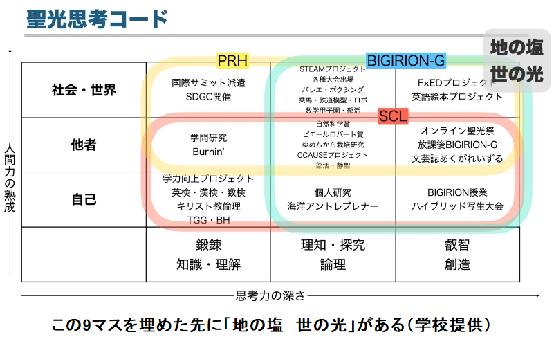 生徒たちがこの9マスすべてを自分なりの色で塗りつぶして卒業したとき、教育理念である「地の塩 世の光(マタイ福音書にあり、自己犠牲や社会貢献の精神と解釈されることが多い)」の担い手になれると考える。
