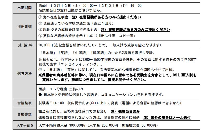・合格発表:12月22日(火)14:00 校内掲示およびHP