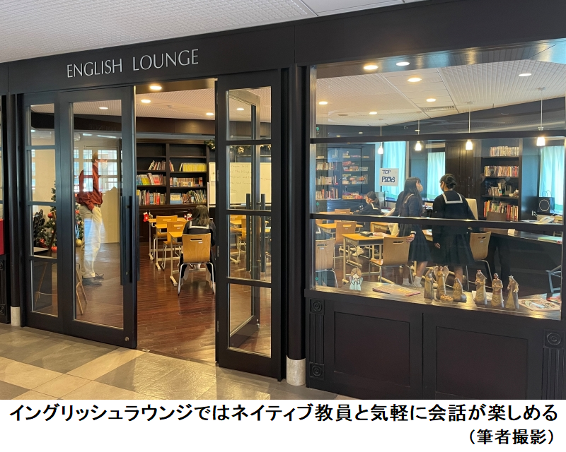 9人のネイティブ教員がいて、英語による礼拝も行われる。使える英語教育は建学当初からの伝統で、English Loungeでは昼休みや放課後にネイティブ教員と気軽に英会話が楽しめる。イギリス、オーストラリア、アメリカ、フィリピンなどへの海外研修プログラムがあるだけでなく、カナダやニュージーランドを含む5カ国24大学への指定校推薦枠もある。