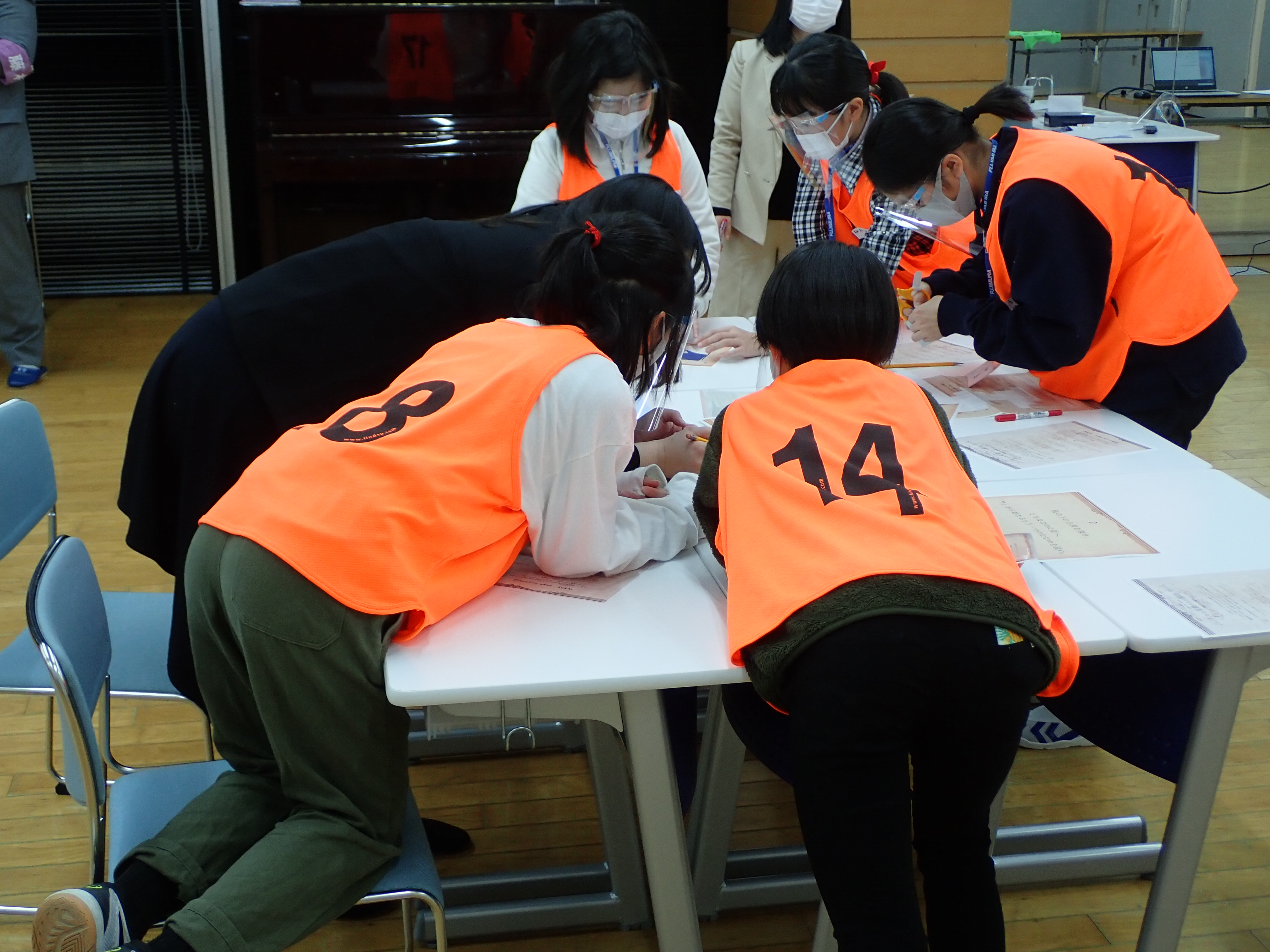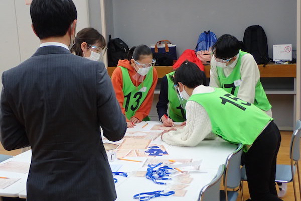 結果は見事的中、おっと残念とに分かれましたが、緊張がほぐれて、チームに親密感が漂い始めたようです。受験生はマスクをして試験に臨むのが“ノーマル”なコロナ禍の中での入試。「脱出ゲーム型」会場では、さらに学校から配られたフェイスシールドを重ねて感染防止を徹底しての協働作業となりました。そんな感染防止グッズを使っていても気持ちを伝え合うにはどう声を出したら良いかも考えながらのスタートでした。