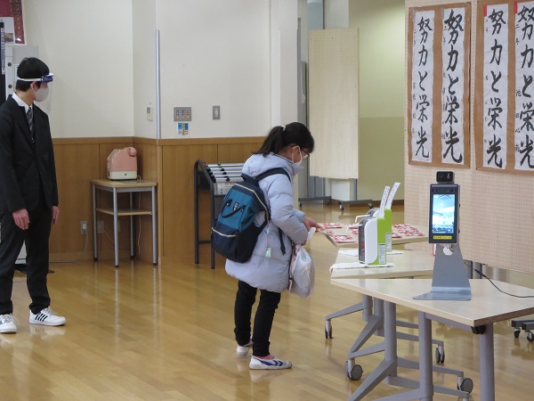 受験生が安心して試験にのぞめるように、しっかりしたコロナウイルス感染症対策が取られていました。来校時の検温と手の消毒はもちろんのこと、校舎入り口で渋滞にならないように土足で入れるスペースを広く確保されていました。