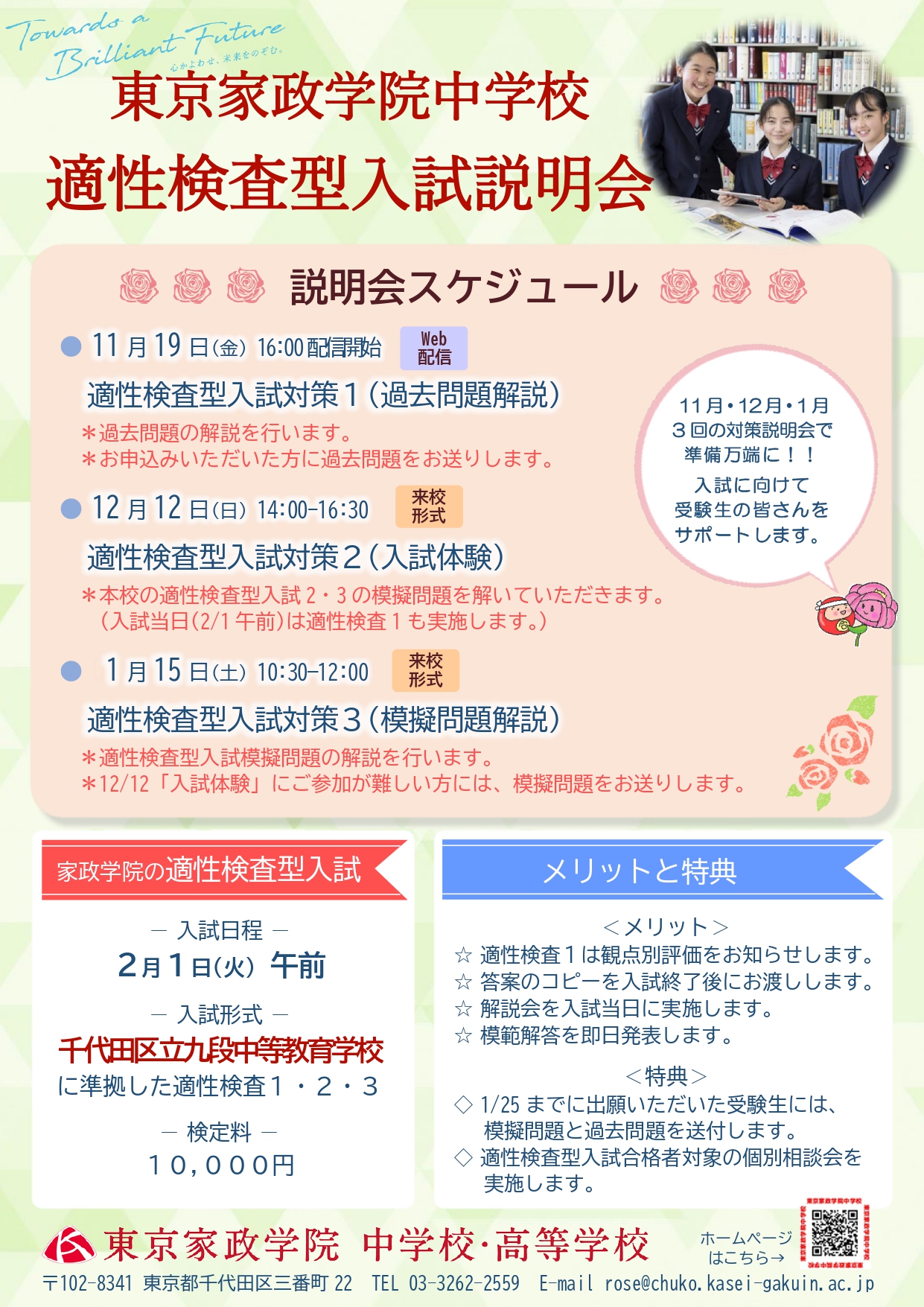 東京家政学院中学校(東京都・千代田区、女子校)は、12月12(日)と1月15日(土)に適性検査型入試対策を開催します。