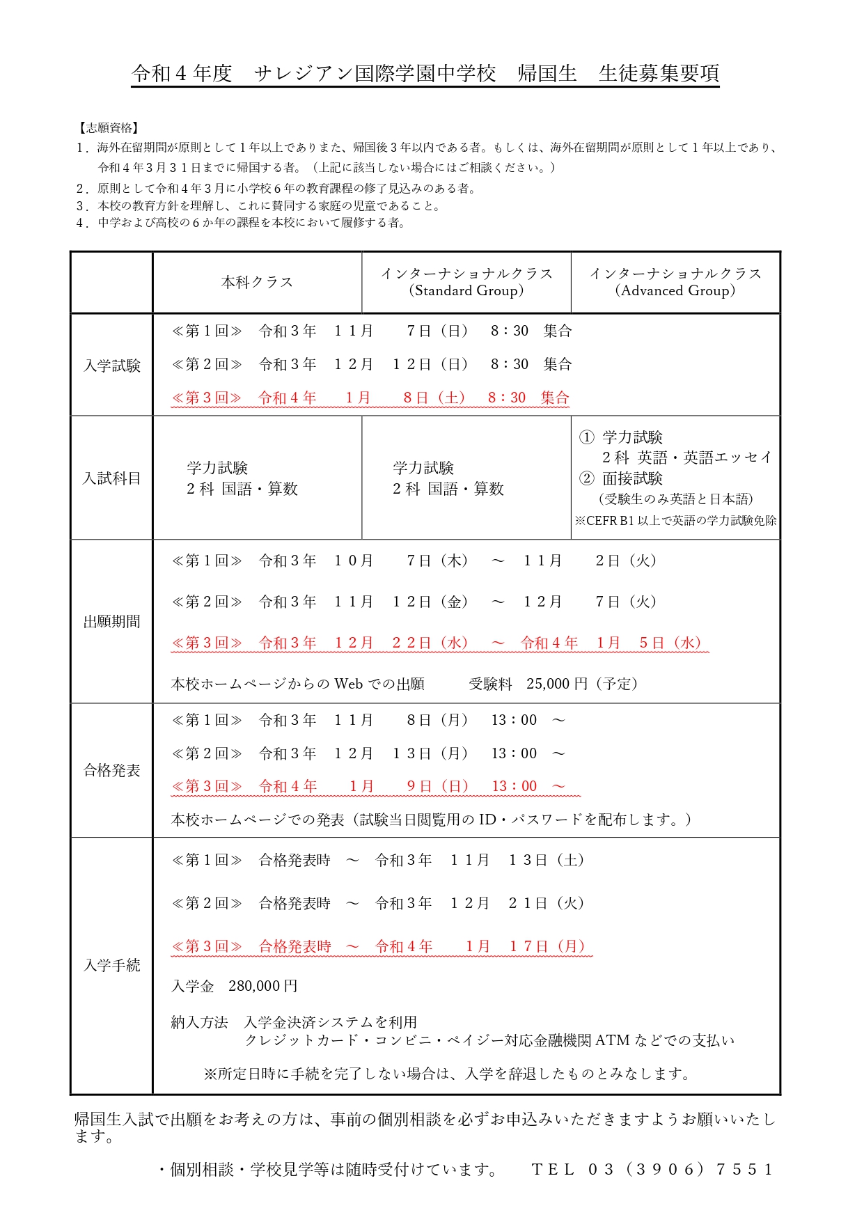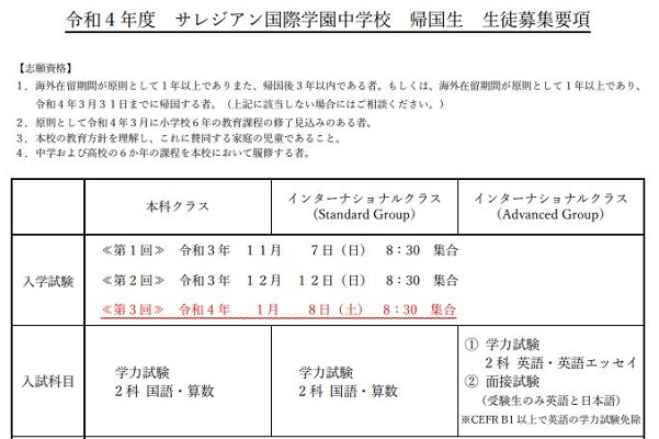 サレジアン国際学園中学校(東京都・北区)が第3回海外帰国生入試を1/8(土)に追加することを公表しました。