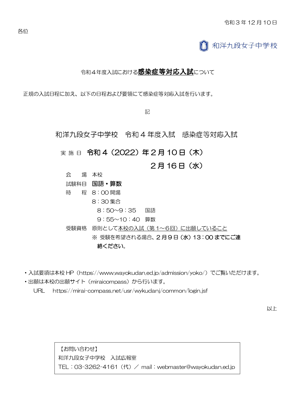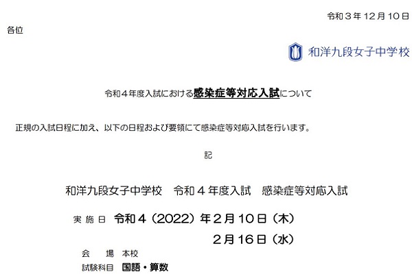 和洋九段女子中学校(東京都・千代田区、女子校)が感染症等対応入試を2/10(木)と2/16(水)に実施することを公表しました。