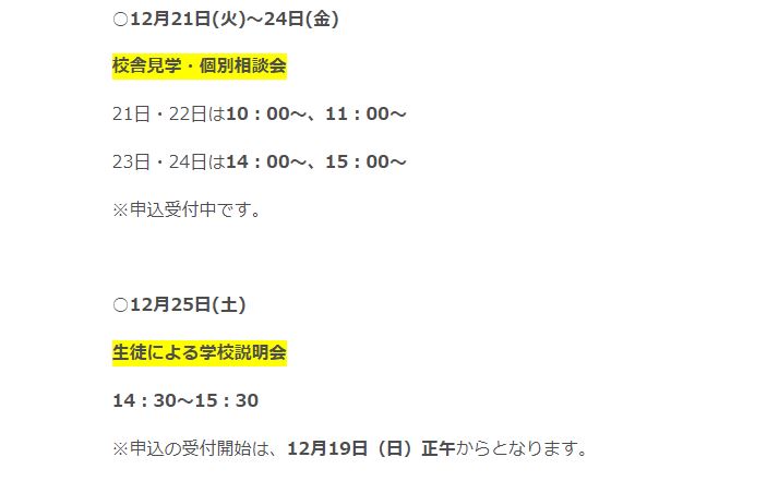 12月21日(火)から24日(金)には校舎見学・個別相談会が、12月25日(土)には生徒による学校説明会が開催されます。