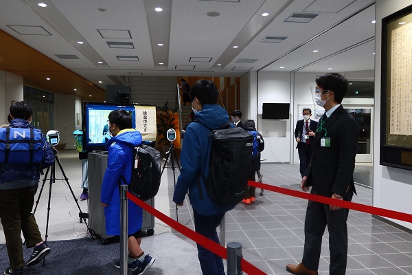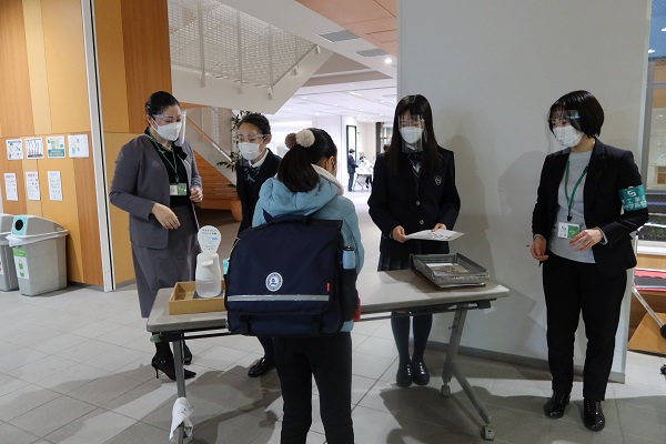 【写真】は、校舎へ入るときの感染防止対策。落ち着いた様子で検温や消毒に臨んでいました