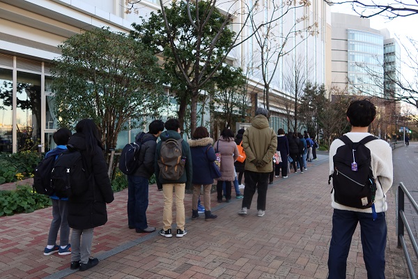 【写真】は、開門前、正面エントランスに並ぶ受験生親子たち
