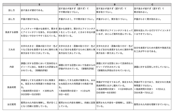 特筆すべきは、入試の評価基準が受験生に公開されている点です(右の写真参照)。話し方や発表する姿勢、工夫点、内容などについて注意すべきところがルーブリックにまとめられています。受験生たちはルーブリックを参考にしながら、入試に向けてプレゼンテーションの準備を行うことができるのです。
