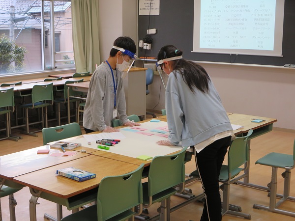 どのようにまとめたら分かりやすいか、どのようにしたらアイディアが伝わるかを、お互いに尊重しながら話し合って決めている様子でした。