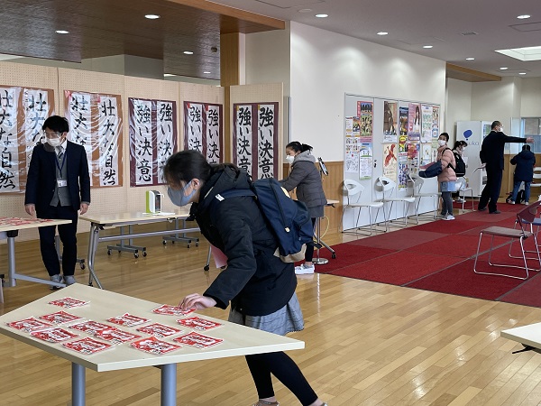 会場内では、入り口すぐのラウンジで靴を履き替え、検温と手指消毒を済ませた受験生が在校生の応援メッセージが書かれたカイロを手に取り、控え室へと進みます。