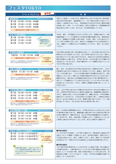 37校が参加する個別相談会、学校選びなどの相談コーナー、生徒による座談会、入試講演会や成績アップ講座など様々なイベントが行われます。