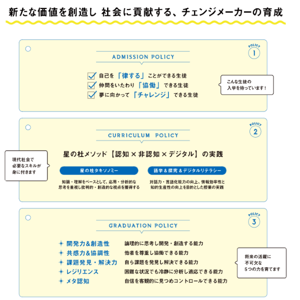 変化の大きな時代も、予測のできない未来にも、生徒一人ひとりがのびやかに過ごし、そして宇宙に瞬く星のように輝く学校となるよう、校名を「星の杜」にしたとのことです。