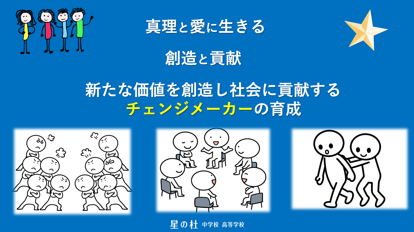 星の杜中学校高等学校のPURPOSE(パーパス)を「創造と貢献」、SCHOOL MISSION(スクールミッション)を「新たな価値を創造し 社会に貢献する、チェンジメーカーの育成」を掲げております。