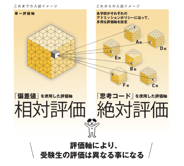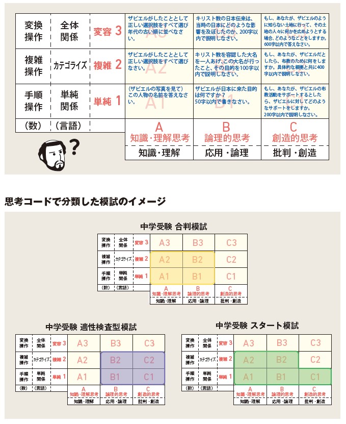 ダイバーシティの時代、教育観も多様化し、「思考力型入試」・「プログラミング入試」・「プレゼン型入試」など、これまでにない新たな入試が年々増えてきております。また文部科学省は、大学入試制度改革にあわせて、学校の通信簿などこれまでの相対評価から、絶対評価に移行するように教育現場へ促しています。それにより、中学入試でも多様な評価軸が生まれ、これまでの教科型の模試では、受験生の学力が計れなくなってきていることは周知のことと存じます。それらを踏まえ、首都圏模試センターでは2020 年度から、「偏差値」による相対評価と「思考コード」による絶対評価の2 軸を使用して、受験生の指導に役立てられる模試にリニューアルいたしました。